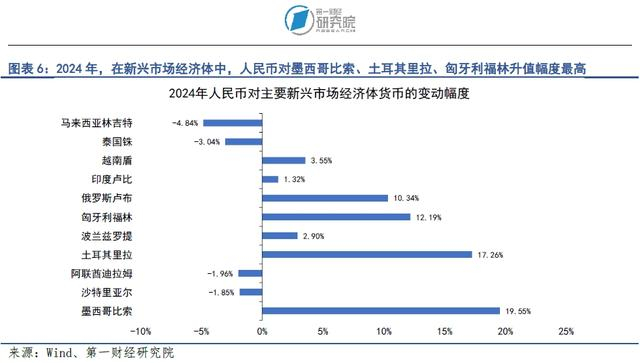 与多数国家货币相比,人民币对美元贬值幅度较小,带动人民币对一篮子货币升值。2024年,在发达国家中,人民币对韩元、新西兰元和日元升值幅度最高,分别为10.97%、9.45%和7.41%。在新兴市场经济体中,人民币对墨西哥比索、土耳其里拉和匈牙利福林的升值幅度最高,分别为19.55%、17.26%和12.19%。