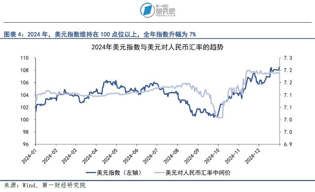 从外部环境来看,2024年“强美元”是国际外汇市场的一个关键词。2024年,美国通胀情况有所改善,CPI同比增速由年初的3.1%下降至年末的2.9%,美联储也在9月的议息会议上开启降息周期。然而,更低的通胀和边际放松的货币政策并未带动美元指数下行,相反,2024年美元指数全年维持在100点以上,指数年内升幅达到7%。