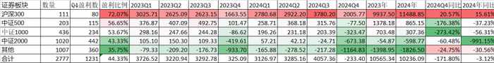 Q4盈利面最大的是沪深300板块,盈利比例高达72.07%,最低的是其他类,只有35.75%。Q4的5个规模板块,只有沪深300是同比增加了20.57%,从2023Q4的1663.55亿元,增加到2024Q4的2005.77亿元,其他几个板块不仅同比下降,而且整个板块都是亏损的,中证500从2023Q4的盈利101.47亿元到2024Q4的亏损77.50亿。反而是1007家公司的其他类,虽然2024Q4亏损了1164.83亿元,但同比2023Q4亏损933.70亿元,亏损增幅24.75%还是最少的。