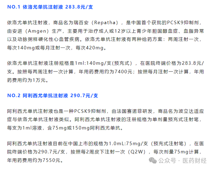 根据医药财经此前的梳理,PCSK9抑制剂供给端正呈现出快速增长的态势,其中早在两年前就通过医保谈判进入国家医保目录的依洛尤单抗和阿利西尤单抗价格相对亲民,年治疗费用约在7200元左右。(见:中国最便宜的10款抗体药)