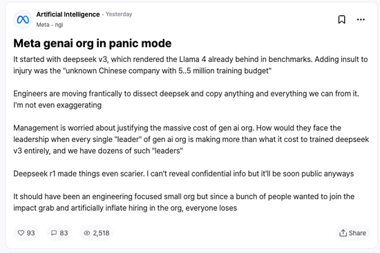 来自竞争对手的反应或许是对 DeepSeek 最好的认可。据 Meta 员工在匿名职场社区 TeamBlind 上的爆料,DeepSeek-V3 和 R1 的出现让 Meta 的生成式 AI 团队陷入了恐慌。