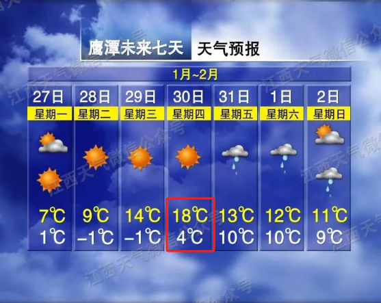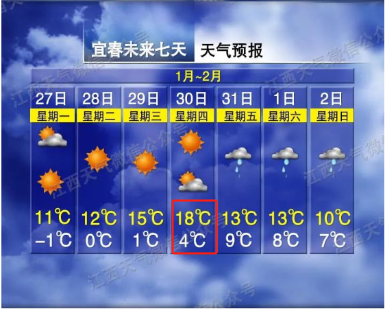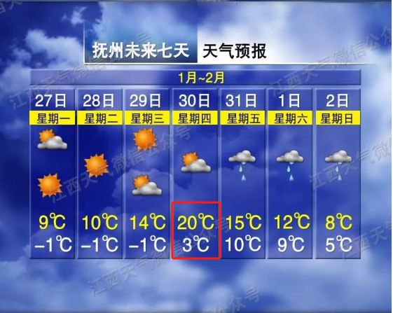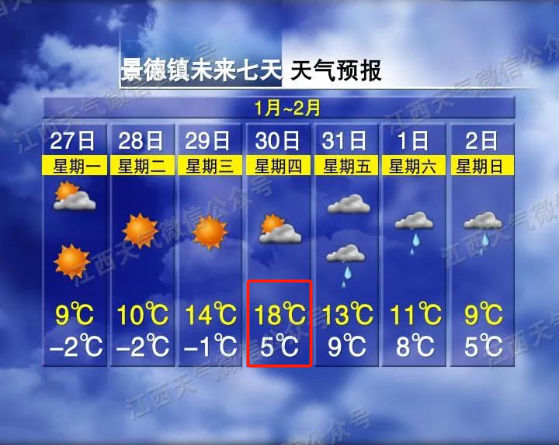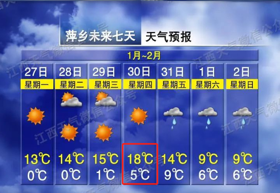 1月29~30日(初一到初二):全省晴转多云,其中30日晚上赣北部分地区转小雨。气温有所回升,30日最高气温将上升至16~20℃。