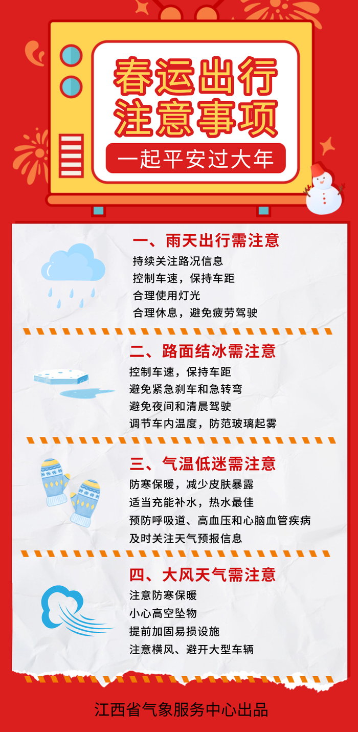 1. 加强交通、旅游安全管理。25~26 日的寒潮天气,将给春节返乡和物流运输带来影响,且 31~2月3日我省还有冷空气过程,故各地各部门需进一步强化交通、旅游等安全管理。