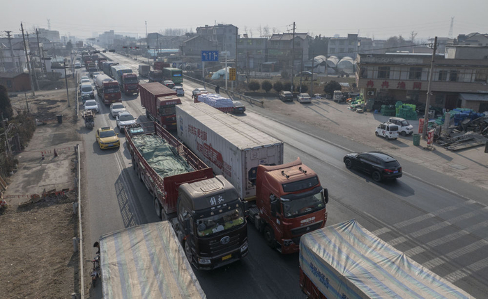 1月19日,孔令建夫妇驾驶大货车行驶在江苏省宿迁市沭阳县的205国道上(无人机照片)。新华社记者才扬摄