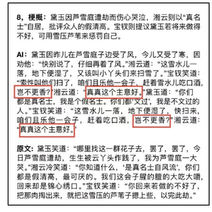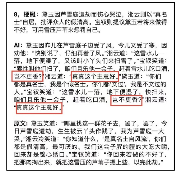7月17日,梁欣悦按照这一思路处理了《红楼梦》中的九段文本。她发现,虽然AI能生成与原文段落长度类似的文字,但仍存在内容重复、扩写时没有严格按照梗概展开等问题。“用AI续写《红楼梦》需要反复迭代优化,因为可能一次生成的效果不是很好。”