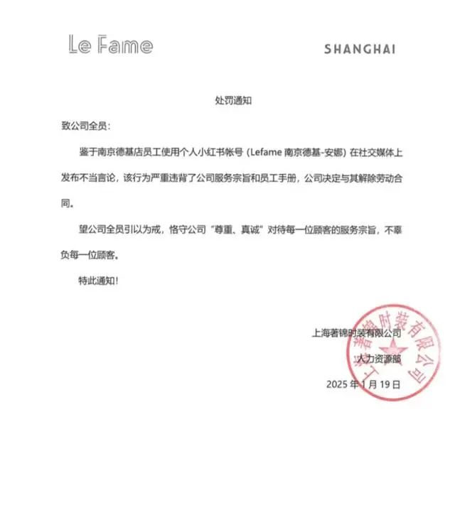 随后,“Le Fame拉飞姆”还发布了一则致歉信,因我司员工在个人社交平台发表不当言论造成的不良影响,我们深感遗憾和抱歉。在此向消费者及粉丝朋友们致以最诚挚的歉意!此次事件也使我们深刻反思及认识到终端员工素养的重要性,我司将加强全体员工道德素养、职业修养、服务意识的培训及提升。
