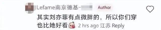 有网友指出,该柜姐曾在评论区与网友互动时称赞网友“你穿得比刘亦菲好看”“其实刘亦菲有点微胖,所以你们穿也比她好看”,且均以“Lefame南京德基”的显著标识账号发文。