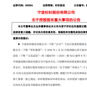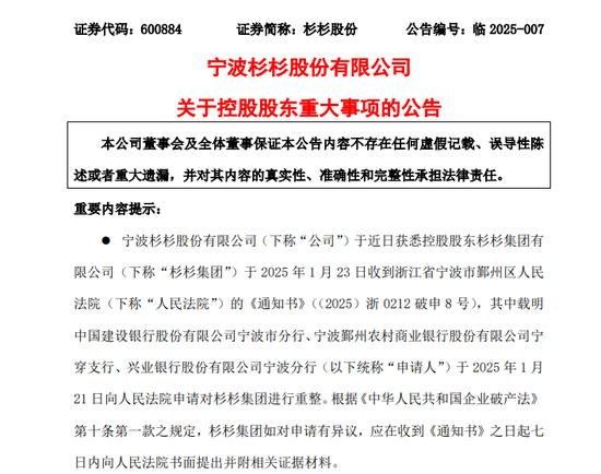1月26日晚,杉杉股份(600884)公告,公司于近日获悉控股股东杉杉集团于1月23日收到人民法院的《通知书》,杉杉集团的相关债权人已向人民法院递交对杉杉集团进行重整的申请。