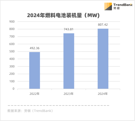 2024年燃料电池装机量为807.42MW,同比增长8.6%。