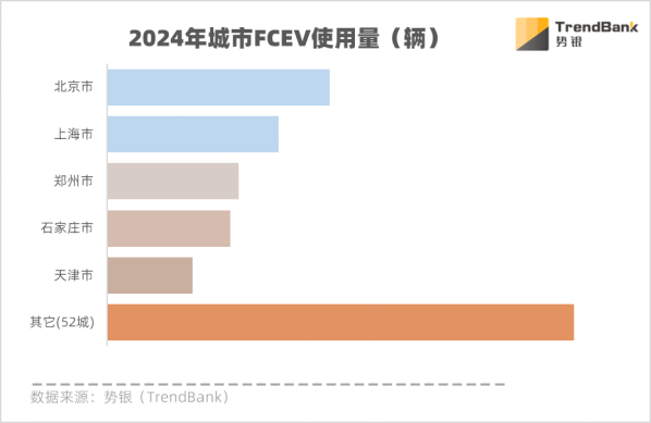 从使用城市看,全年上牌的7131辆燃料电池汽车在北京、上海、郑州、石家庄、天津、合肥、唐山、张家口、广州、安阳、佛山、重庆等57个城市投运。其中,北京市使用数量最多,达到1323辆,排名第一;上海市排名第二;郑州市排名第三。