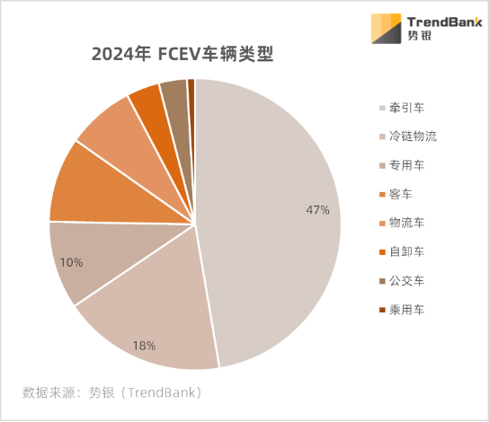 从2024年上牌的燃料电池汽车数据中显示,燃料电池牵引车为主,占比47.3%;燃料电池冷链物流车排名第二;燃料电池专用车排名第三。