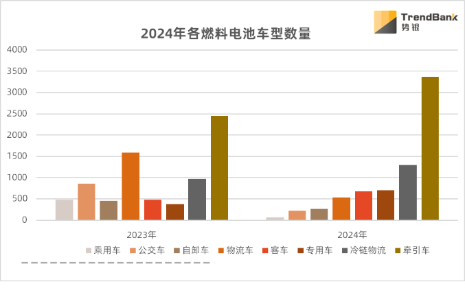 与2023年相比,今年牵引车、冷链物流车的占比都急剧增长,这也进一步说明燃料电池牵引车、冷链物流车经济性凸显,逐步进入商业化阶段,大众接受度正不断提升。
