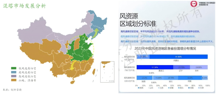 在低风速高切变地区,如河北、山东、河南、陕西、湖北、江苏、安徽等地,以及高风速、高切变的辽宁、吉林、黑龙江都是混塔快速攻略的风能市场。