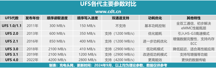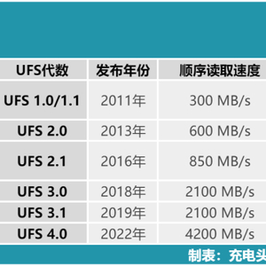 生成式AI对闪存提出了很高的要求,特别是在数据处理速度和传输效率方面,目前最高的闪存标准是JEDEC协会在2022年推出了UFS 4.0标准,相比上一代,传输速度等方面具有翻倍的提升,相信也是之后旗舰手机乃至新一代AI手机的标配。充电头网也将UFS各代的主要参数汇总成下表所示,让各位有一个更加全面的了解