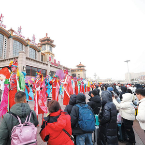 1月26日农历腊月二十七,北京各大火车站迎来了客流高峰。当天上午,在北京站的站前广场上,一场民俗演出为春运增添了浓郁的年节氛围,旱船竹马、五音大鼓、高跷秧歌、舞龙舞狮,吸引了不少旅客驻足。站区各行各业的工作人员和“旅客身边人”志愿者们为旅客送上福字和春联。