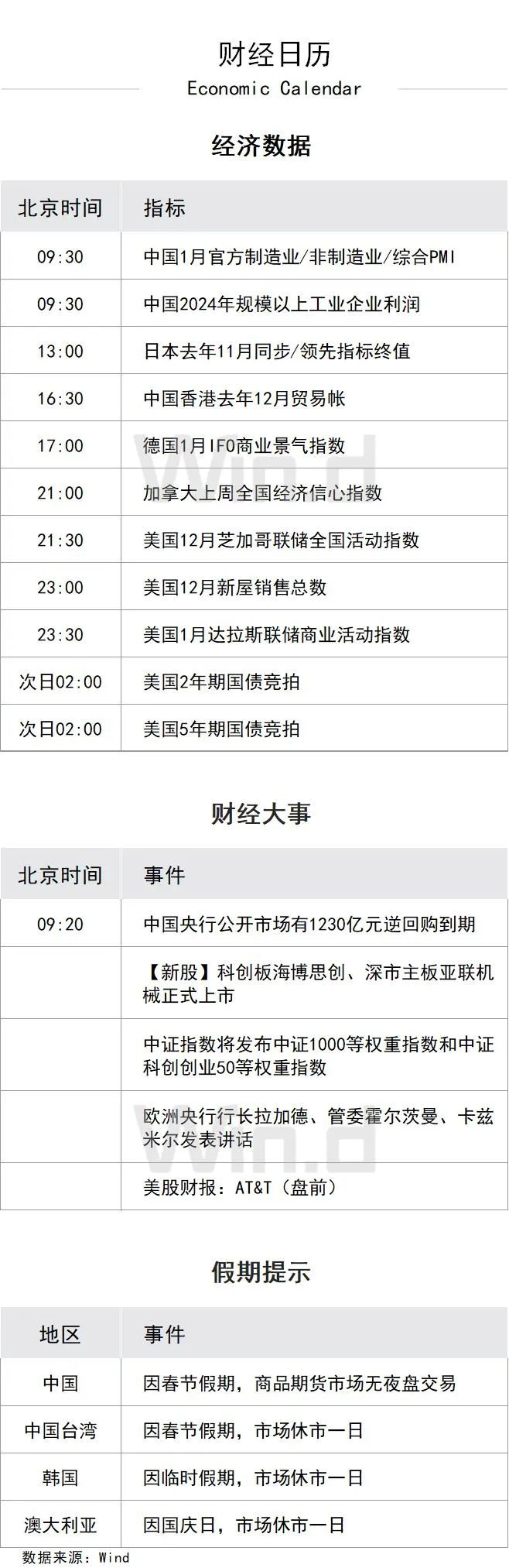 1、未来一周全球市场大事不断。美联储、欧洲央行及加拿大央行将公布利率决议,市场将三者均与特朗普所带来的不确定性相关联。苹果、特斯拉、微软、META等科技巨擘及波音、通用汽车等传统大型企业均将公布财报。中国将公布1月官方PMI,随后包括中国在内的亚洲多地将迎来春节长假。
