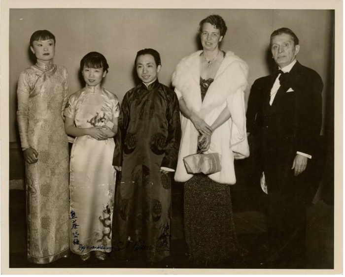 施蕴珍(驻美大使施肇基女儿,Mai-Mai Sze)、熊式一夫妇、罗斯福总统夫人、监制莫里斯·格斯特(Morris Gest),《王宝川》(Lady Precious Stream)纽约演出时的戏院后台,1936年,纽约市公共图书馆馆藏