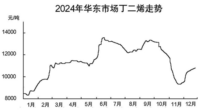 2024年四季度,10月份丁二烯价格跌破万元,深跌至9600元附近,此后窄幅反弹,至年底价格在1.1万元附近。