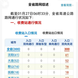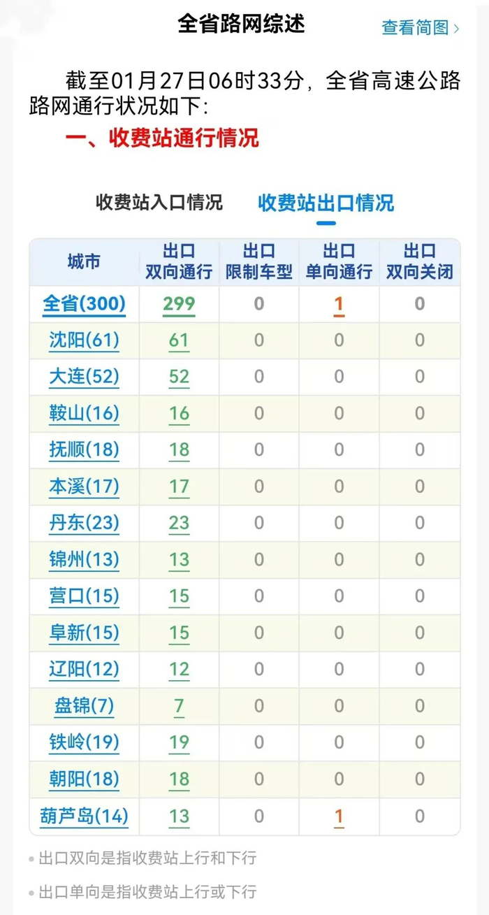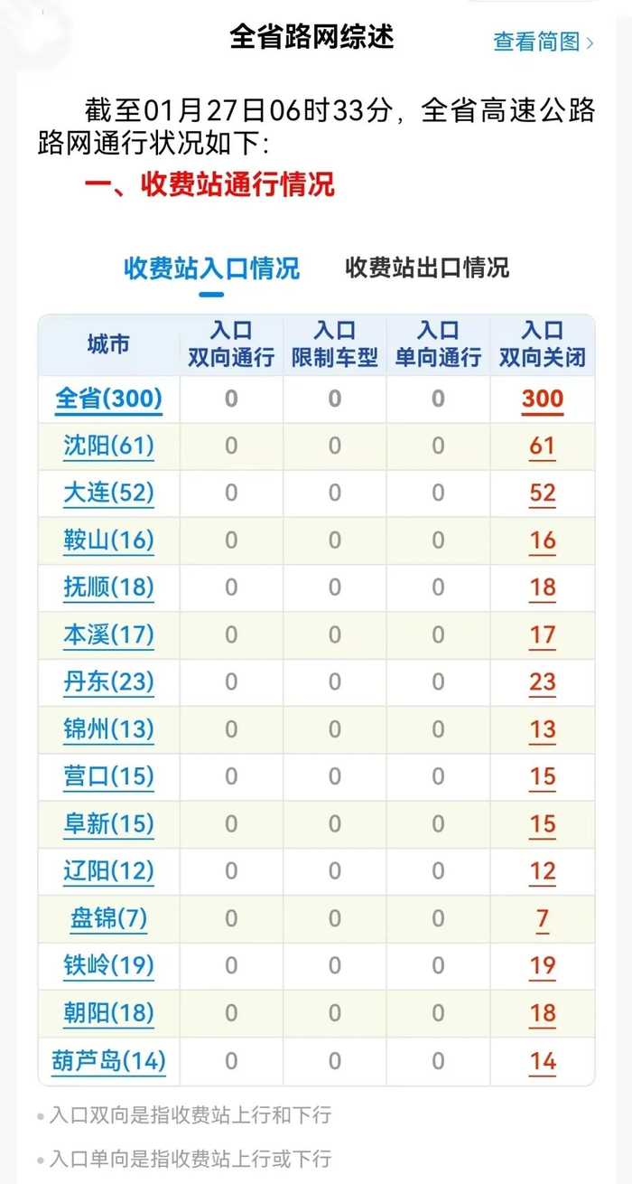 受降雪影响,截至1月27日6时33分,辽宁高速公路入口全部关闭,出口只有葫芦岛1个开通。