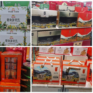 粮油礼盒装受到消费者青睐,尤其是各种杂粮礼盒,比如幸福荣耀(磁器口店)设立了杂粮礼盒专区,有的杂粮礼盒含有黑苦荞、黑豆、黑糯米、黑玉米糁等8种黑色杂粮,有的包含黑米、黄豆、绿豆、糙米、高粱米等8种杂粮。柜台还摆放着五谷杂粮礼盒、杂粮面粉臻品礼盒等。