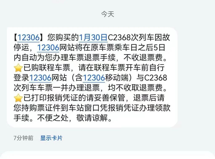 “之后我们就按照既定计划准备了。”李丽称,1月21日下午,她突然收到12306发来的短信,短信显示:“C2368次列车因故停运,12306网站将在原车票乘车日之后5日内自动为您办理车票退票手续,不收退票费。”