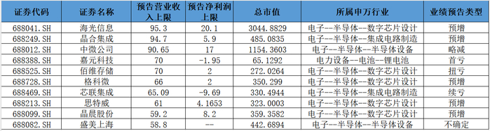 在上述338家发布业绩预告的科创板公司中,按营收上限统计,规模排名前10的公司分别为海光信息、晶合集成、中微公司、嘉元科技、佰维存储、格科微、芯联集成、思特威、晶晨股份、盛美上海。除嘉元科技外,其余9家均属半导体行业公司,营收规模上限预计均超58亿元。