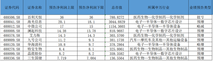 科创板公司2024年业绩预告净利润前十排名(数据截至1月26日)