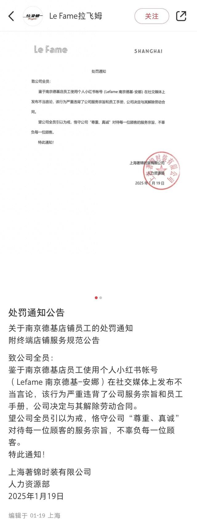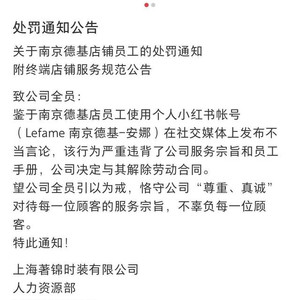 “南京一柜姐因夸网友穿衣服比刘亦菲好看被品牌方辞退了……”1月26日,一条品牌方的致歉信息引发网友热议。1月19日,服装品牌拉飞姆(Lefame)发表致歉信,写道:“因我司员工在个人社交平台发表不当言论造成的不良影响,我们深感遗憾和抱歉。在此向消费者及粉丝朋友们致以最诚挚的歉意!此次事件也使我们深刻反思及认识到终端员工素养的重要性,我司将加强全体员工道德素养、职业修养、服务意识的培训及提升。”