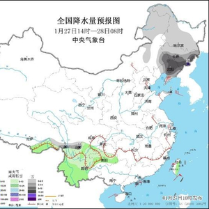 1月27日14时至28日08时,内蒙古东部、东北地区大部、四川南部、贵州中北部、云南东北部等地部分地区有小到中雪或雨夹雪,内蒙古东南部、辽宁中东部、吉林南部和东部、山东半岛北部、四川南部等地部分地区有大到暴雪,吉林东南部局地有大暴雪(20~26毫米)。