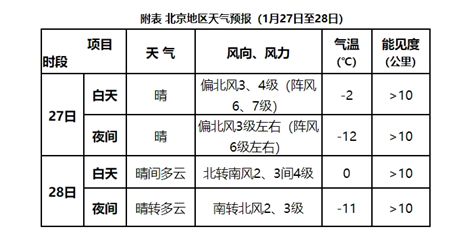 未来两天北京地区天气以晴为主。27日有3、4级偏北风,阵风6、7级。该期间白天最高气温-2~0℃,夜间最低气温-12~-11℃。具体天气预报见下表。