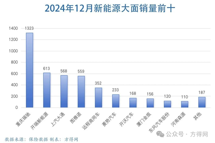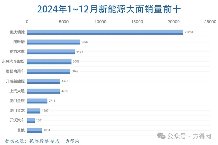 2024年12月,新能源大面销量前十排名,重庆瑞驰继续断层领先;开瑞新能源连续第三个月排名亚军,图雅诺上升两位,仅落后上汽大通9辆,同处第二集团。