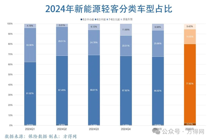新能源轻客市场从新能源中小面(载货容积5方左右)起步,到2023年新能源中面(载货容积6方左右)成为市场主体;2024年,结构最大变化在于新能源大面(载货容积7-8方),虽然新能源大面从年初爆发式增长占市场1/3,到四季度市场占比缩窄为占比1/5。但新能源大面已实现崛起。