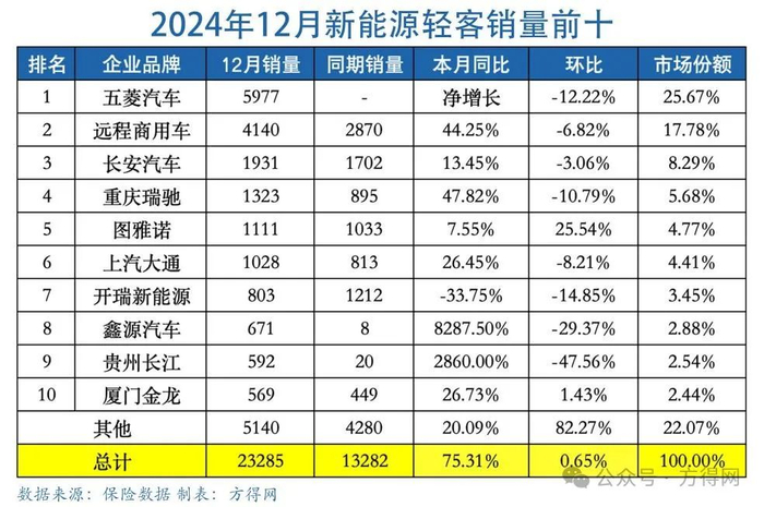 新能源轻客2024年12月销量23285辆、同比增长75.31%。前十榜单又有新变化。