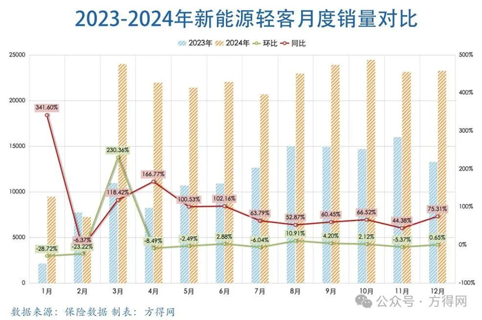 方得网最新获得的终端销量数据(交强险口径不含出口)显示,2024年,国内市场累计销售新能源轻客(车长4.5米~7米,以VAN类封闭式厢式物流车为主)24.5万辆,同比增长78%。其中,2024年12月,新能源轻客销量达到2.3万辆,环比转正增长0.65%,比去年同期(13282辆)大增75%!