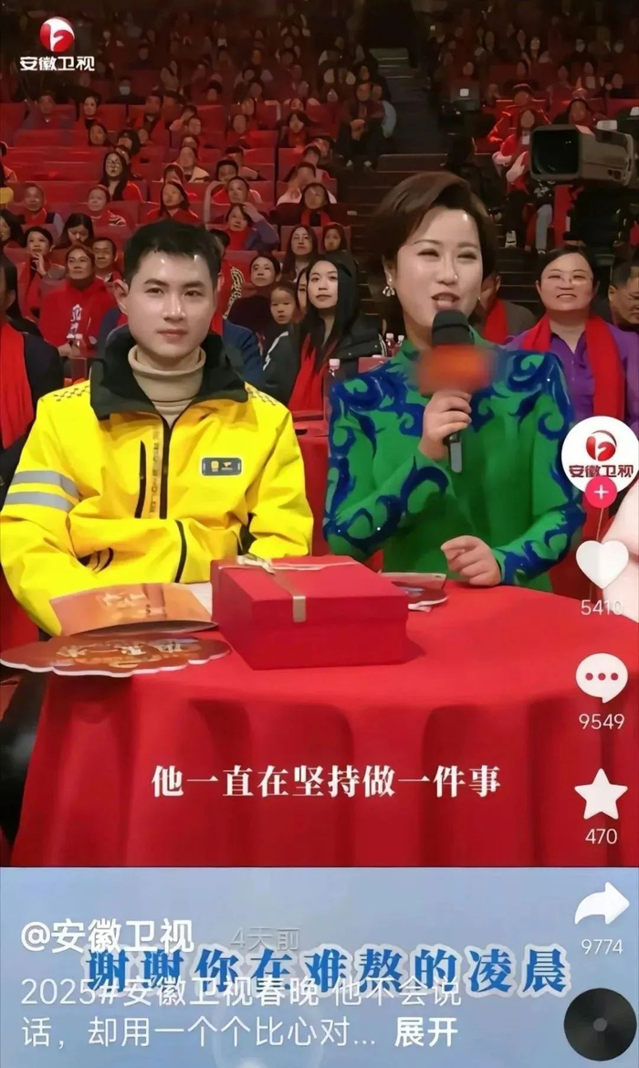 关于邀请“外卖小哥”参演的相关情况:在2025安徽卫视春晚筹备阶段,节目组关注到2023年3月全网“听障外卖小哥比心”的暖心新闻报道,随即与小哥本人取得联系,确认其从事外卖工作,工作记录完备可查,且确为听障人士。基于此,节目组向其发出录制邀请。