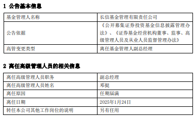 长信基金副总经理邓挺因任期届满离任 中国经济网 中国经济网官方账号 2025.01.2715:43 关注 中国经济网北京1月27日讯 近日,长信基金管理有限责任公司发布基金行业高级管理人员变更公告,邓挺因任期届满离任副总经理。