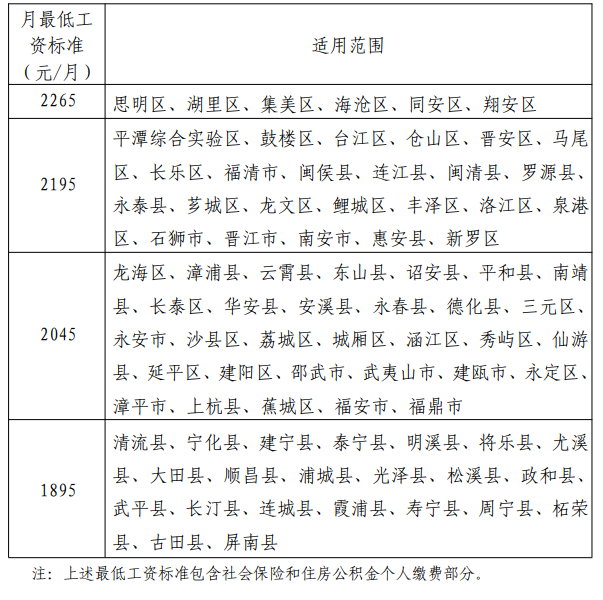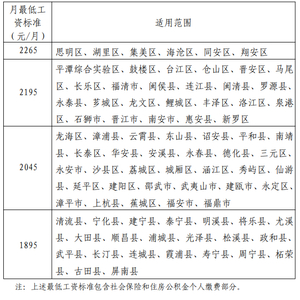 福建省月最低工资标准