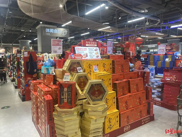 为了配合春节氛围,店里还专门开辟了一条一百米左右的年货通道,堆满了礼盒类的年货商品,成为市民们采购年货的首选。