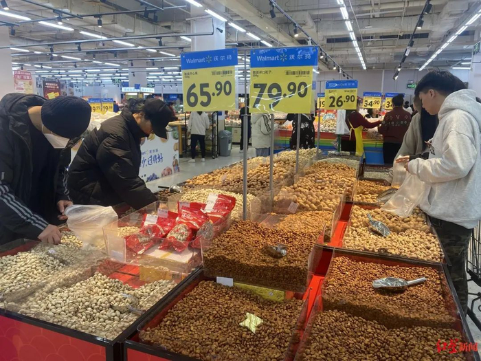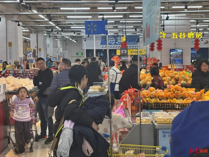 1月26日下午2点,赶在春节前夕,红星新闻记者探访了沃尔玛超市交大路店,店里已迎来了购物小高峰,人头攒动,市民们消费热情高涨。据沃尔玛超市交大路店鲜食副总经理何春燕介绍,这段时间每天从下午2点开始,店内客流会逐渐增多,一直持续到晚上9点,傍晚时段人流量会达到高峰。