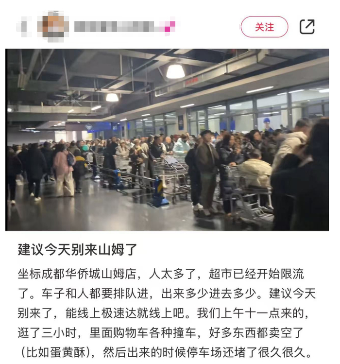 这几天,成都、上海、杭州等多地的山姆会员店都在上演“人从众”,有网友感慨“全国的山姆都被挤爆了”。