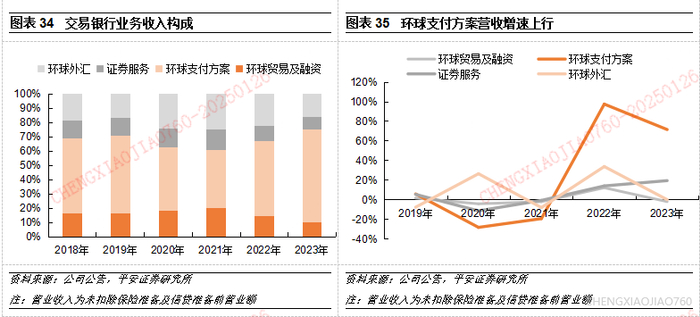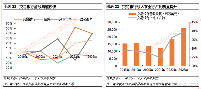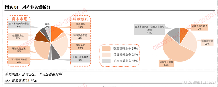 交易银行营收增速高于整体。对比业务重拆分后的三个板块,近两年交易银行营收增速明显提高,据公司公告,23年末交易银行营收同比上行39.2%,高于对公业务整体13个百分点;资本市场业务23年营收表现较好;信贷收入21年以来营收持续负增,在对公业务中形成拖累。从占比来看,交易银行收入在全行占比明显提升。2021年以来,交易银行收入迅速上行,据公司公告,截至2023年末,交易银行收入为261亿美元,在全行中的收入占比也提升至40%,交易银行贡献了全行近半数的营业收入。