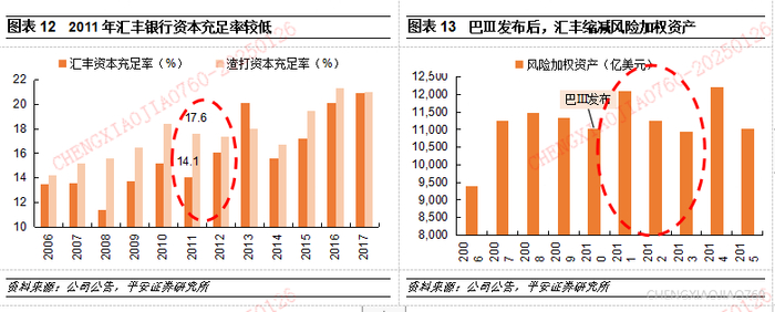 巴塞尔协议Ⅲ发布后,据公司公告,汇丰银行风险加权资产从2010年末的1.10万亿美元提升到2011年末的1.21万亿美元,同比上行近10%,资本充足率随之下行了1.1个百分点至14.1%,接近监管红线,同期资本充足率低于渣打银行3.5个百分点,资本充足率处于较低水平,为提升资本充足率,汇丰银行开始对资产进行出售。