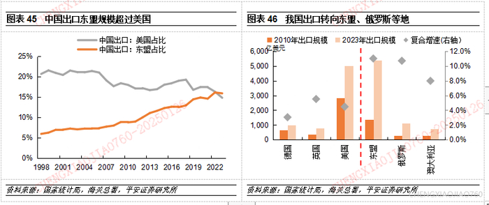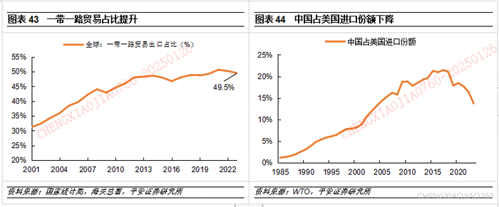 我国出口贸易结构转变,韧性较强。整体来看,虽然美国对中国进口逐渐下降,但全球贸易出口占比来看,我国对外贸易韧性较强。从结构来看,我国对东盟国家出口占比持续提升,对美国出口持续下降,2023年对东盟出口占比首次超过美国,成为我国第一大出口市场。一带一路倡议提出以来,一带一路沿线国家贸易出口占全球比重持续上升,2023年末,一带一路贸易占比达到49.5%,成为全球主要贸易区域。