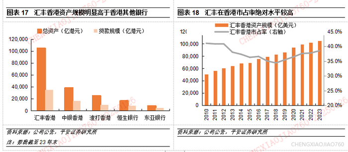 汇丰在香港市场拥有较强的竞争力。汇丰从香港起家,作为香港第一批银行,凭借香港和上海的贸易金融服务,积累了原始客户资源与业务经验,在香港金融领域初步站稳脚跟。与此同时,汇丰银行在19世纪就开始参与香港货币发行工作,长期的发钞实践使其在货币供应环节占据关键位置,也逐渐巩固了汇丰在香港的竞争力。从资产规模来看,对比同样在香港金管局注册的几家香港银行(分公司),汇丰香港的资产规模和贷款规模明显高于其他几大银行,据公司公告,23年末资产规模为10.5万亿港元,贷款规模为3.6万亿港元,明显高于中银香港、渣打香港、恒生银行和东亚银行的资产和贷款规模。汇丰资产规模在香港市占率绝对水平较高,据公司公告,23年末市占率为39%,且从时间序列数据上看,汇丰香港的市占率基本维持在35%以上,在香港竞争力较强。