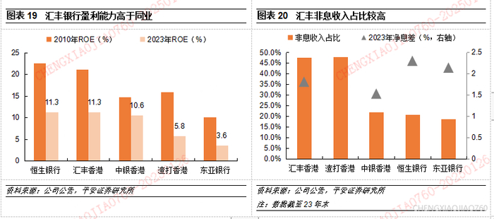 汇丰香港盈利能力较强。汇丰香港的ROE水平优于同业,据公司公告,23年末ROE为11.3%,持平恒生银行,高于可比同业平均水平。拆分来看,汇丰香港盈利能力主要来自非息收入,23年末汇丰银行非息收入占比为48%,居于可比同业首位;但汇丰净息差水平较低,据公司公告,23年末净息差仅为1.81%,低于同业平均水平,汇丰银行盈利更多依靠非息收入,体现出汇丰较强的财富管理能力和外汇交易能力。