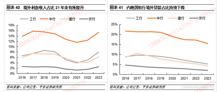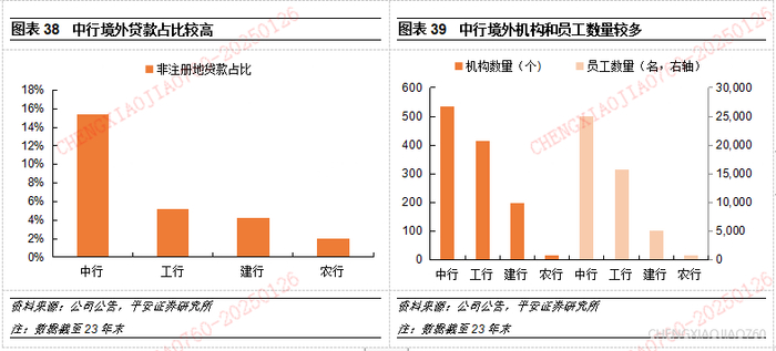 从我国四大国有银行海外业务情况来看,中国银行海外业务相对更具优势,新中国成立初期,中行就被定位为主要承担外汇与外贸业务的银行,而后不断拓展国际业务以及国际经营网络。根据公司公告,截至23年末,中行境外贷款占比为15%。工行、建行境外占比约为4%-5%,农行仅为2%,中行明显高于其他国有行。从网点覆盖的国家数量、境外机构总数以及境外员工总数来看,根据公司公告,截至23年末,中行拥有534个海外机构和25,104名海外员工,显著高于可比同业。