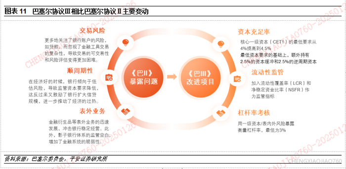 金融危机后,全球金融秩序重置,巴塞尔协议Ⅱ暴露出在对交易风险、顺周期风险和表外业务的监管方面存在的问题,巴塞尔协议Ⅲ对相应问题提出监管标准,并提高了对资本充足率的要求,在8%的基础上加上2.5%的资本缓冲、0-2.5%的逆周期资本缓冲,并且对系统重要性银行增加1%要求,合计资本充足率要求为11.5%-14%。巴塞尔协议Ⅲ将场外衍生品和证券融资业务等交易风险纳入风险加权资产考量,提高了标准法评估的风险敏感性,风险权重从四档提升至六档,对风险加权资产进行重新划分后,汇丰银行风险加权资产明显上行。