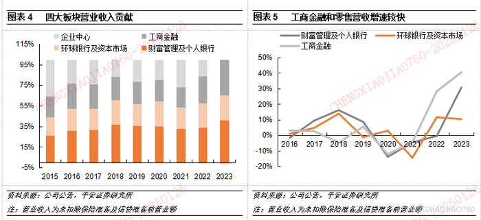 从占比来看,零售、对公占比较为稳定。据公司公告,汇丰2023年财富管理及个人银行、工商金融、环球银行及资本市场三个板块收入占比分别为41%、35%、24%,企业中心受交通银行投资减值的影响,收入为负。从时间序列的数据来看,工商金融、环球银行及资本市场、财富管理及个人银行三大板块贡献基本稳定,企业中心波动较大。对公业务占比约6-7成,高于零售业务,对公业务仍是汇丰主要盈利来源。从增速来看,零售业务和中小企业工商金融业务收入增长较快,环球银行及资本市场业务增幅平稳,企业中心增速波动较大,近两年回落明显。