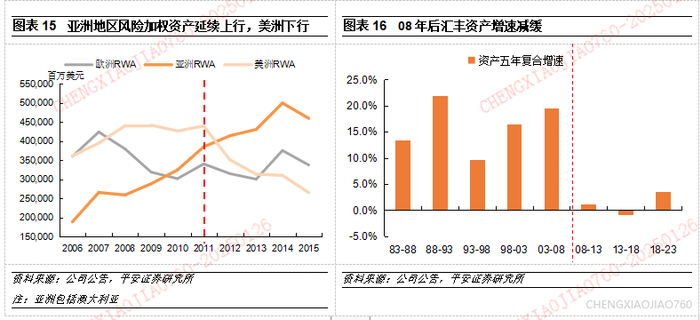2008年金融危机之后,汇丰银行资产规模增速明显减缓。据公司公告,汇丰银行资产规模2008-2013年的五年复合增速为1.1%,与金融危机前2003-2008年19.6%的五年复合增速相比,资产规模增速回落18.5个百分点,资产扩张速度明显减缓。汇丰银行资产增速回落的背后一方面是收到金融危机的冲击和巴塞尔协议Ⅲ的限制,另一方面也是汇丰战略转向的结果,汇丰改变并购扩张业务方式,转为依靠利润积累推动经营规模的有机增长,放缓了在全球的扩张速度。从全球区域布局来看,亚洲地区的风险加权资产维持高增,延续上行趋势,但美洲地区的风险加权资产在战略转向后规模明显下降。