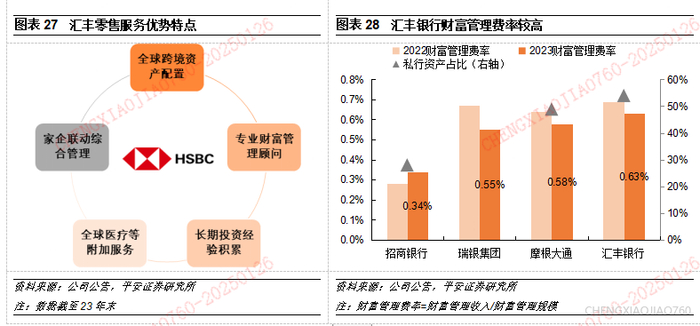 从盈利情况来看,汇丰财富管理费率较高,盈利能力较强,同时也凸显了汇丰的服务优势。我们根据公司财富管理收入/财富管理规模计算的23年末汇丰财富管理平均费率为0.63%,高于瑞银、摩根大通和招商银行。财富管理高盈利能力来自大规模私行客户资产,据公司公告,汇丰银行23年私行资产占全部财富管理比例为54%,高于同业水平,对高净值客户管理较好,提升财富管理整体盈利。